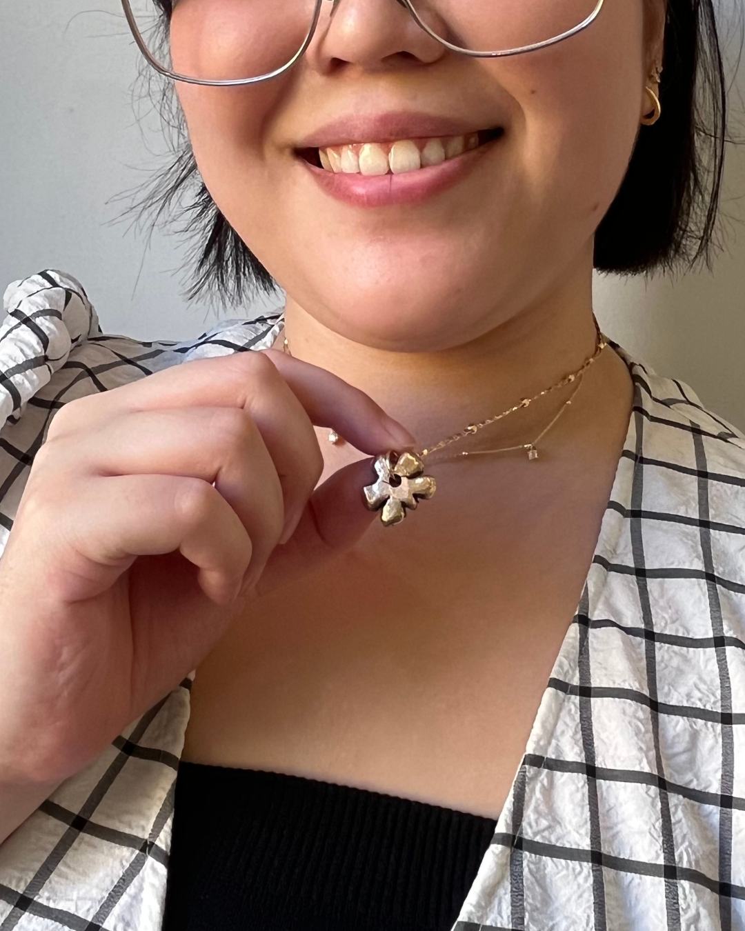 There’s no actual gold in the clay. We use Bronze Clay, made from a blend of fine bronze powder (a mix of copper and tin metals), organic binders, and water. When fired in a kiln, the binders burn away and the metal particles fuse together, leaving a solid bronze piece.